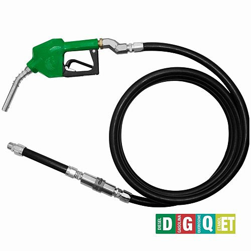 Mangueira em baixo relevo com trama de aço, montada com terminais em alumínio, conexão giratória Z 3/4″, válvula Breakaway não reconectável, conector para Breakaway e bico de abastecimento automático.